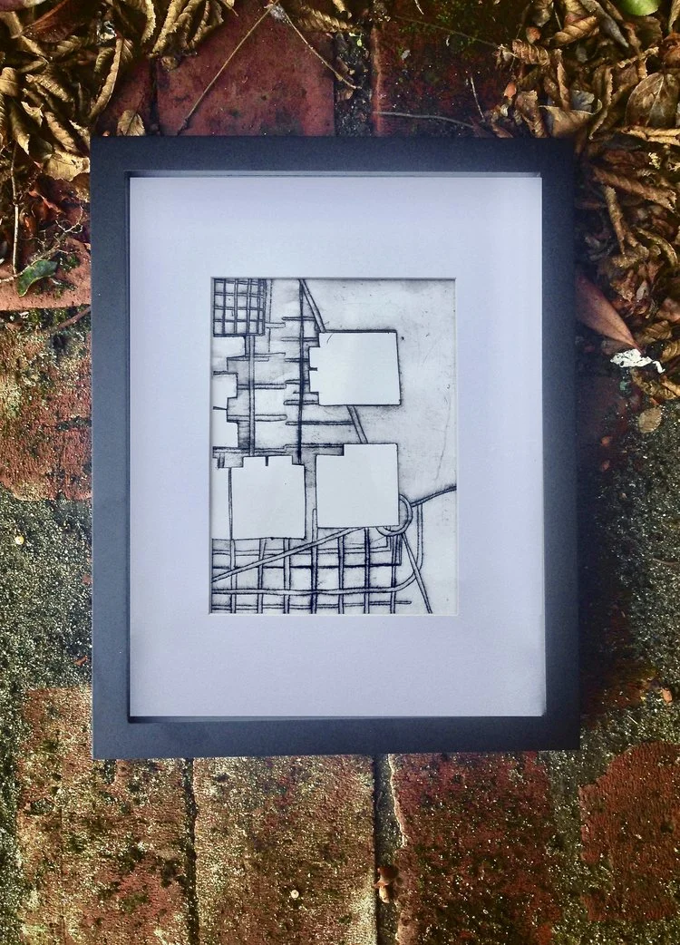 This intaglio print was created in connection with the Christchurch earthquake back in 2014. During this time, a lot of the city’s most prominent buildings were being demolished. I spent an afternoon biking around the city, taking photos of both the rubble and the structures that survived. As I looked at the scaffolding, it reminded me of a Lego set, fitting together to create the building blocks for something bigger and better to come.